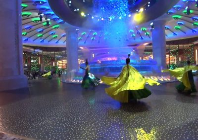 Employing multiple lighting effects including LED panels that are embedded inside the lower portion of the fountain, The Fortune Diamond materializes from within a massive curtain of water and showcased against a triumphant musical score. This dazzling display is the centerpiece of the Galaxy Resort in Macau.